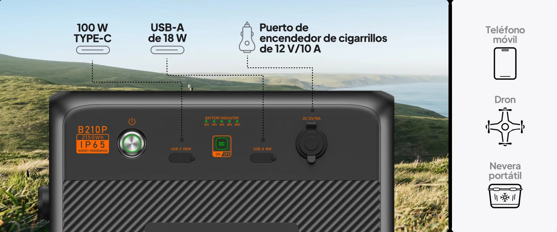 No es solo una simple batería de expansión, el B210P ofrece funcionalidad independiente ya que cuenta con múltiples puertos de CC, incluido un USB-C de 100 W, un USB-A de 18 W y un puerto para encendedor de cigarrillos de 12 V/10 A, lo que le permite cargar teléfonos inteligentes, computadoras portátiles y drones. , mini refrigeradores y más. * Se requieren cables adicionales para cargar el automóvil y cargar CA (se venden por separado).