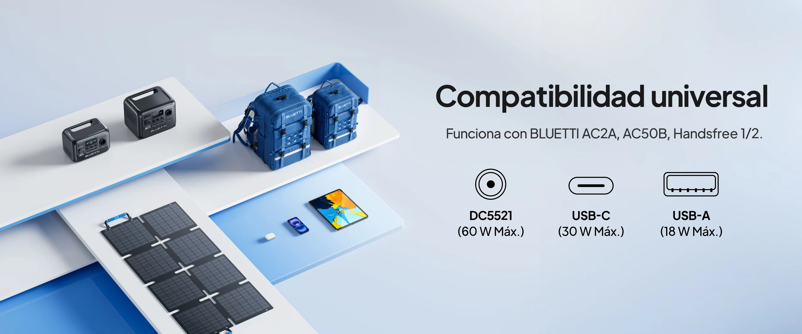 • 3 puertos de salida de CC:USB-A (18 W), USB-C (30 W), DC5521:23,1 V/60 W