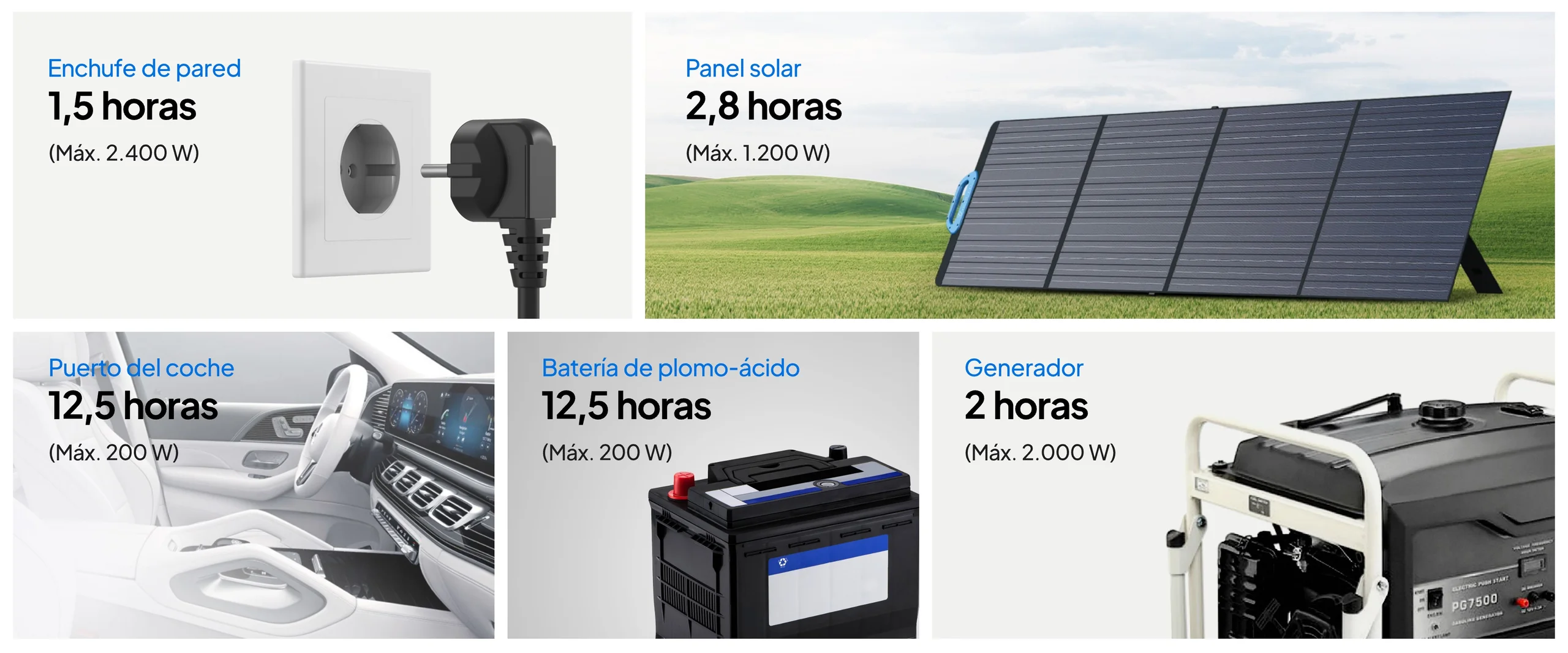 • Recarga por red, coche y solar